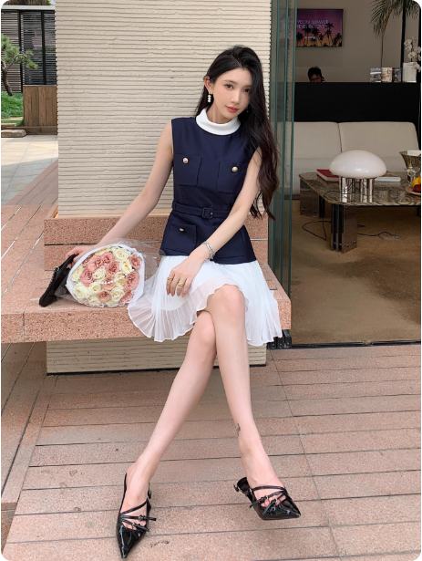 百褶雪纺短裙小香风气质无袖假两件连衣裙高级不撞款