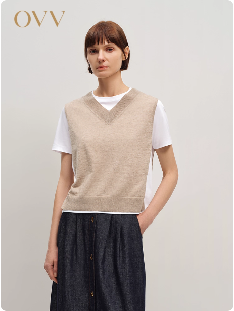 秋冬新款女装休闲时髦撞色叠穿假两件设计短袖针织衫