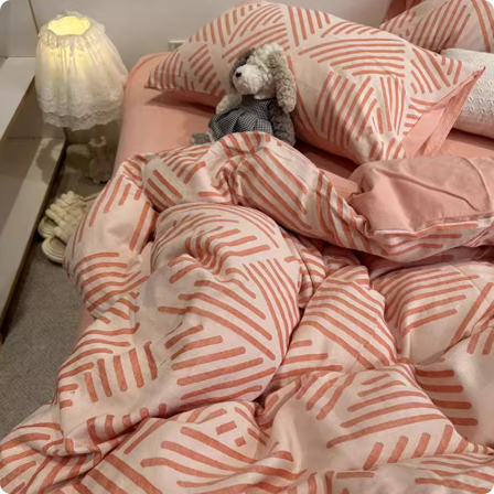 粉色水洗棉提花简约格四件套全棉纯棉粉色1.5m被套