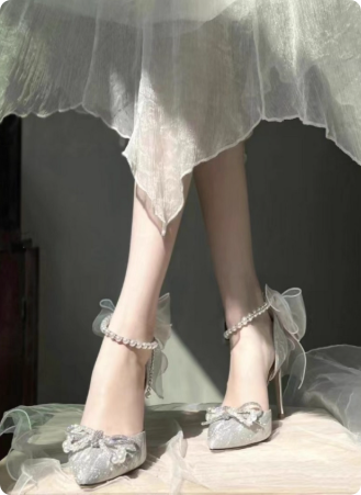 银色珍珠链婚鞋女夏季新款尖头蝴蝶结细跟18岁成人礼水晶高跟凉鞋
