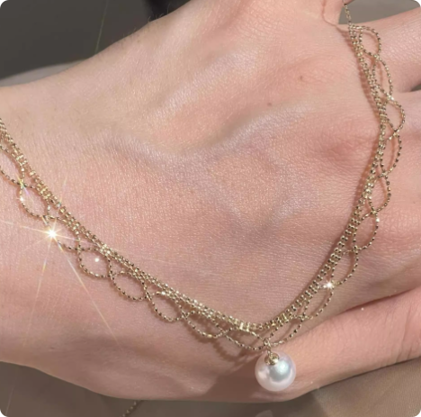 18k金黄金天然海水正圆强光akoya珍珠吊坠素金蕾丝项链锁骨链颈饰
