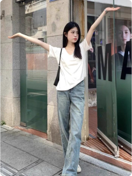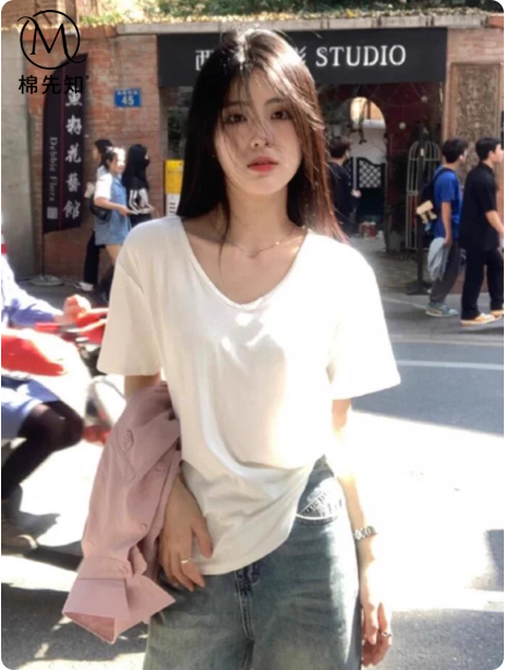 白色v领短袖正肩t恤女夏2025新款松弛感宽松韩版慵懒风高级感上衣